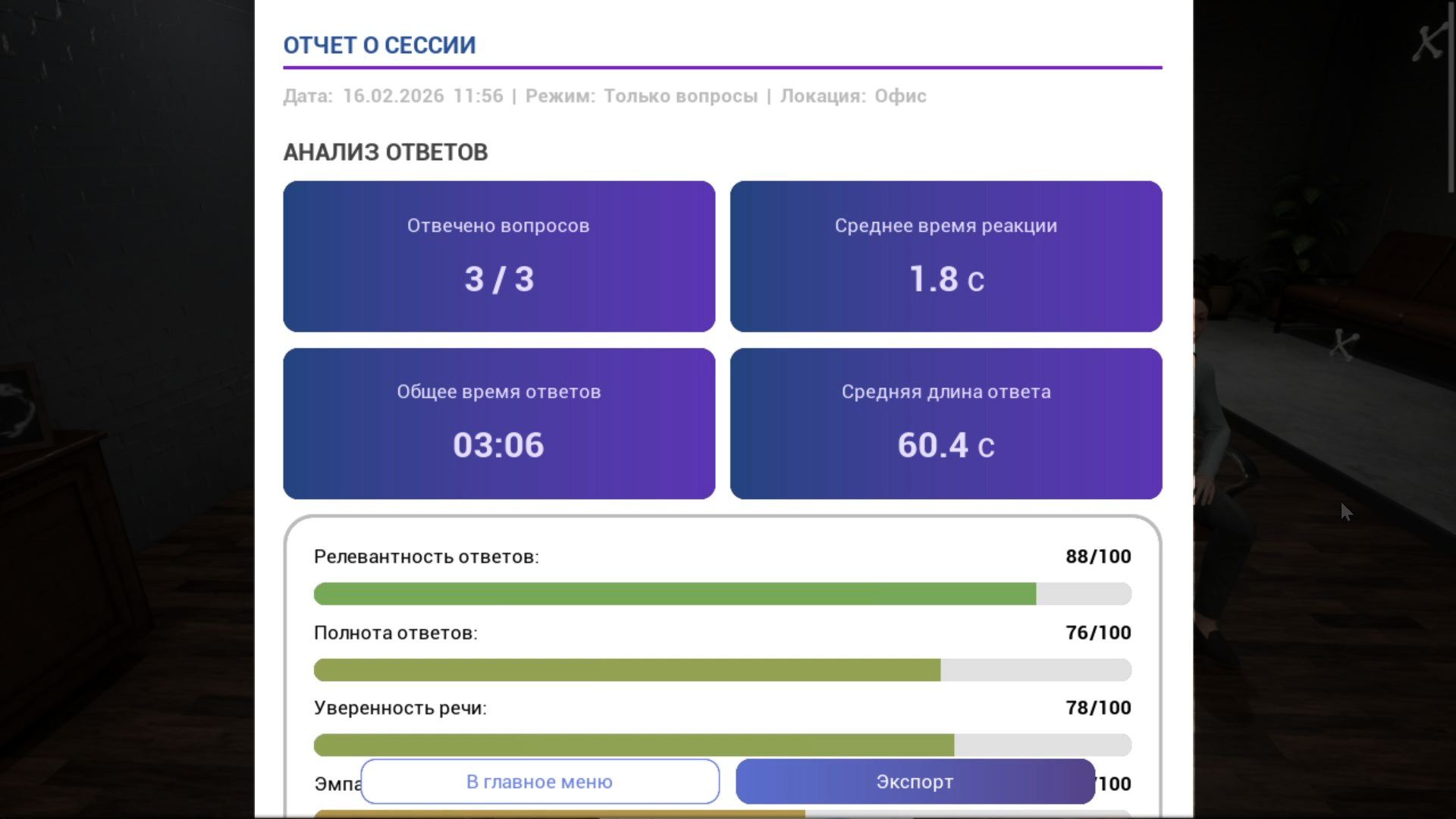 | Обратная связь субъективна или отсутствует | Система оценивает каждый ответ по десяткам параметров | Измеримый прогресс между тренировками |
